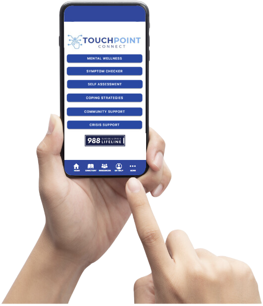 The TouchPointConnect smartphone application offers a range of helpful features to promote mental wellness and provide support. With buttons for mental wellness, symptom checker, self-assessment, coping strategies, community support, crisis support, and a 988 Suicide Crisis Lifeline button, users can access resources and assistance when needed. The app aims to empower individuals by providing easy-to-use tools and connections to enhance their overall well-being and access critical support during times of crisis.